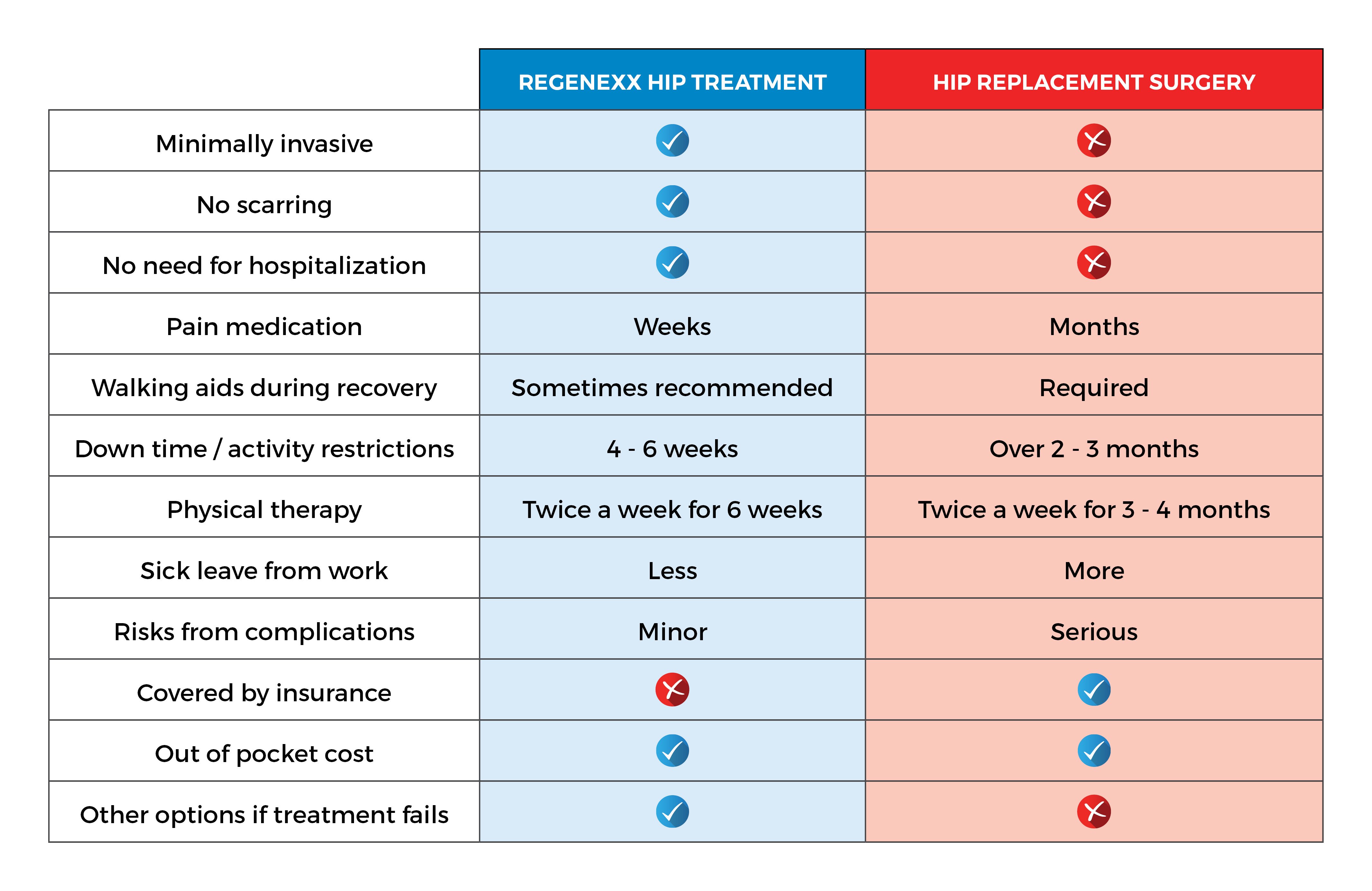 Disclaimer: Table details are originally from Regenexx Corporate. Like all medical procedures, Regenexx procedures have a success and failure rate. Regenexx treatment and surgical results may vary dependent on the joint treated, an individual’s overall condition, health, the number, type, and frequency of procedures, and recovery response times.
